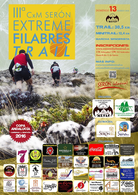 El Club de Montaña las Menas vuelve a organizar la tercera edición CxM Extreme Filabres Trail, tercera prueba puntuable para la Copa Andaluza de CxM 2016, que tendrá lugar el próximo 13 de marzo. Como en las ediciones anteriores contaremos con un trail de 30,5 Km y una minitrail de 12,4 KM. El trazado de la prueba discurrirá por los parajes más impresionantes de la sierra Filabres, consiguiendo una carrera de gran belleza y dureza.