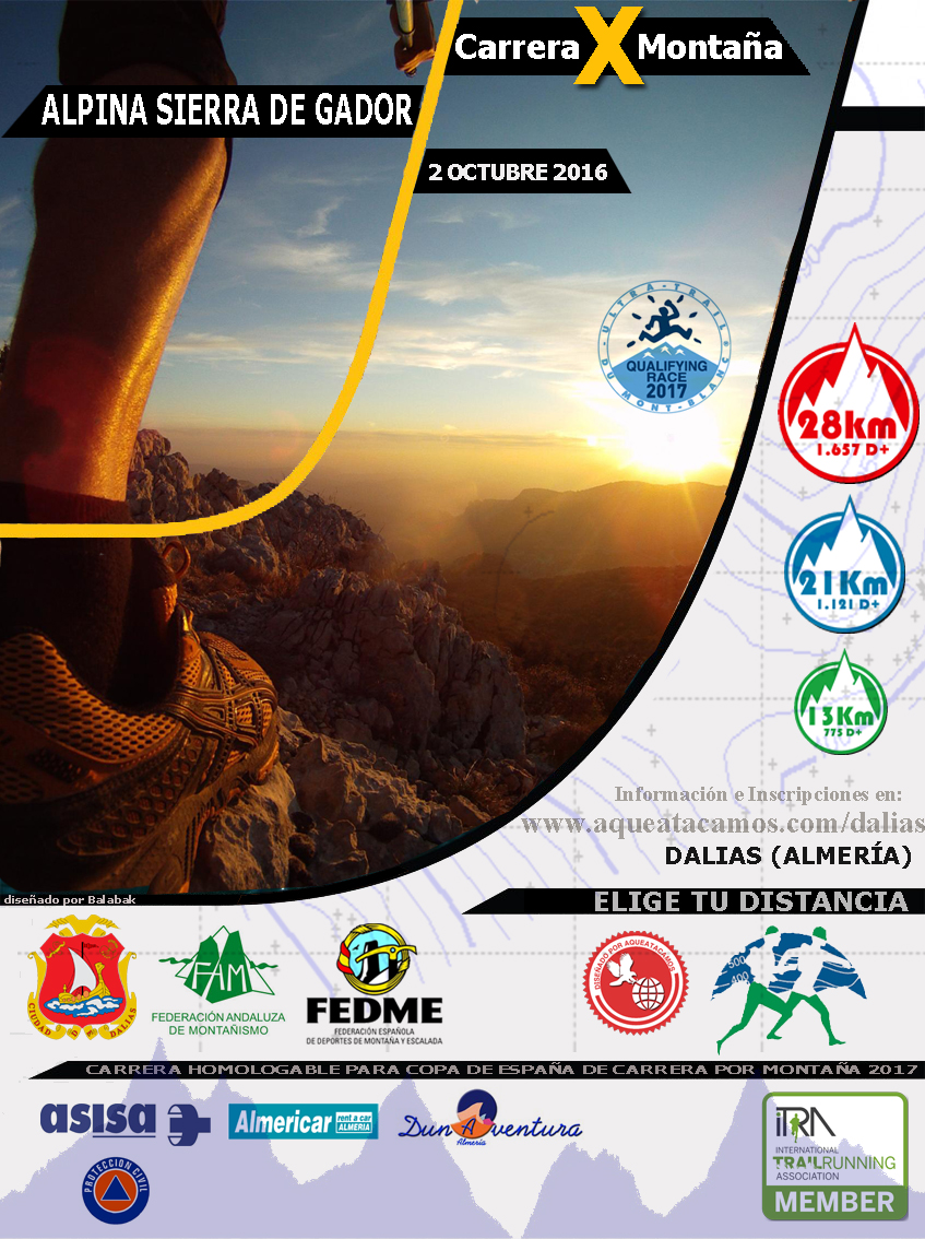 La III CARRERA POR MONTAÑA ALPINA SIERRA DE GADOR-DALIAS de la provincia de Almería, 28,6 Km con un 95 % de senderos en un marco inmejorable con vistas al mar mediterráneo, Sierra Nevada, sierra de Filabres mantiene aún abiertas sus inscripciones para la prueba del próximo 2 de octubre. La organización, a cargo del club A Que Atacamos y la FAM, lleva trabajando en este proyecto más de un año y su idea es que se quede como referencia de medias maratones alpinas del sur de España. La organización ofrece una carrera de montaña con la exigencia de la distancia de la carrera larga 28 kms. y con un recorrido de 21,6 para que se pueda disfrutar del mismo entorno con menos kilometraje.