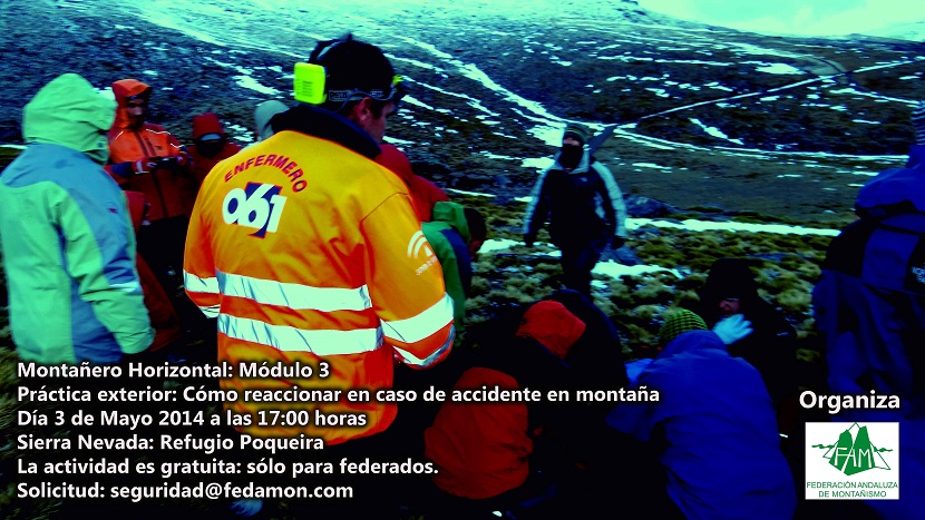 El Comité de Seguridad de la FAM ha organizado para el día 3 de mayo a las 17 horas en el refugio de montaña Poqueira una práctica de Montañero Horizontal, consistente en realizar las primeras actuaciones por parte de los propios compañeros del accidentado en el caso de sufrir un accidente en montaña. Para ello se va a contar con personal médico, habrá diferentes talleres, hipotermia, fracturas, y construcción de camillas de fortuna, se usará el material del que dispone el refugio para emergencias y se enseñará a los participantes a usar el material en caso de accidente además de enseñarles el protocolo a seguir en estos casos.