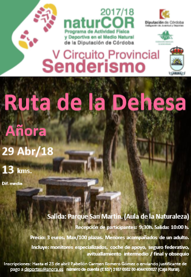 El domingo 29 de abril de 2018, dentro del V Circuito Provincial de Senderismo de Córdoba, organizado por la Diputación de Córdoba junto con la Federación Andaluza de Montañismo, se celebrará octava actividad de esta edición, en esta ocasión en el municipio de Añora, se trata de la RUTA DEHESA DE LA VERA, en la comarca de los pedroches.