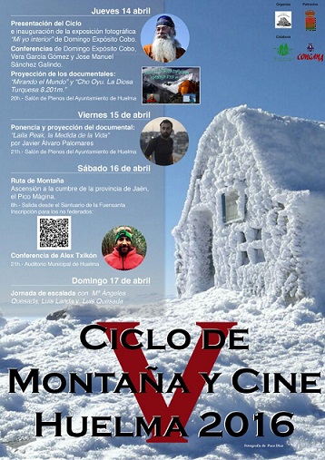 Huelma acogerá por quinto año consecutivo el Ciclo de Montaña y Cine. Será del 14 al 17 de abril. Se inaugurará el jueves 14 a las 20.00 horas en el salón de plenos del ayuntamiento de Huelma con la presentación del ciclo, la inauguración de la exposición fotográfica "Mi yo interior", de Domingo Expósito Cobo, la conferencia de Domingo Expósito, Vera García y José Manuel Sánchez y la proyección de los documentales "Mirando el mundo", "Cho Oyu. La diosa turquesa 8.201 m". La inauguración, en representación del presidente de la Federación Andaluza de Montañismo, Julio Perea Cañas, la llevará a cabo el delegado de la FAM en Jaén, Juan Antonio Hueltes.
