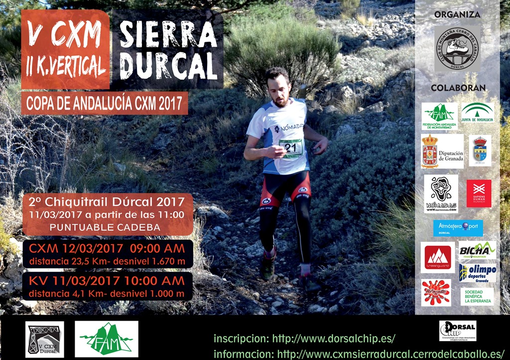 La carrera por montaña Sierra Dúrcal, organizada por el Club Cerro del Caballo, celebra este año su quinto aniversario con la designación por parte de la Federación Andaluza de Montañismo como primera prueba puntuable para la Copa de Andalucía de CXM 2017. Con un duro y exigente trazado, 23,5 km y 1,670 metros positivos, recorre sitios emblemáticos de la Sierra de Dúrcal, la Casilla del Agua, el Cortijo del Droguero, la Rambla, el Río Dúrcal. En definitiva, un recorrido para sufrir y disfrutar a partes iguales. Este año se van a realizar algunos cambios en la zona de meta para darle mayor realce y comodidad, tanto para corredores como público. Para las categorías cadete y junior, y para todos los que se inicien o quieran correr menos, tenemos el V MINITRAIL SIERRA DÚRCAL, con poco menos de 11 km y 600 metros positivos. Como premio al esfuerzo los vencedores de cada categoría recibirán un jamón serrano.