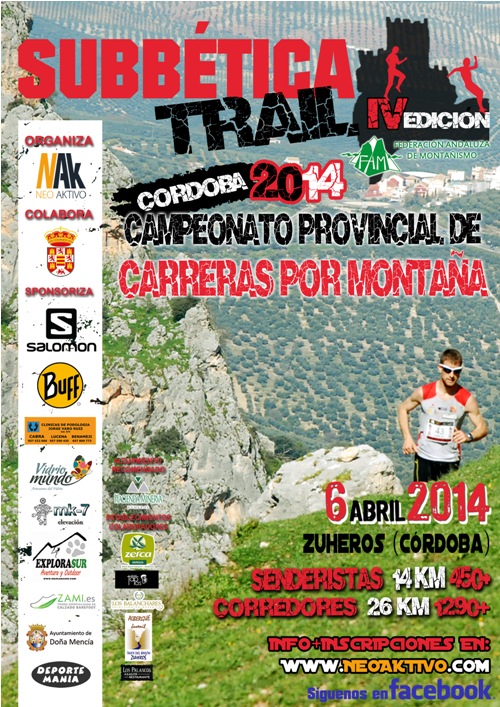 La cuarta edición de la carrera cordobesa, valedera para el Campeonato Provincial de CxM de Córdoba, que se celebra en el entorno de la Subbética Cordobesa y en las inmediaciones de la bella Villa de Zuheros el próximo 6 de abril 2014, abrirá su plazo de inscripción el próximo 21 de enero hasta el 1 de abril. Con un recorrido espectacular, con un trazado para todos los atrevidos y con un paisaje increíble la IV Carrera por montaña Subbética Trail se presenta como un evento a tener en cuenta para muchos atletas venidos de distintos puntos de la geografía andaluza. Una nueva edición que pretende como en años anteriores cuidar cada detalle para que el corredor se sienta como en casa. Avituallamientos, bolsa de regalo, comida de clausura, servicio de guardería, trofeos y regalos para los participantes, reportaje gráfico oficial y audiovisual, trato personalizado y muchas sorpresas esperan en esta nueva edición.