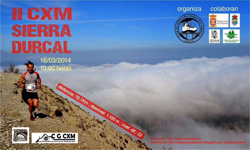 La "CARRERA POR MONTAÑA DÚRCAL 2014", que se celebrará en el municipio de Dúrcal el próximo domingo 16 de marzo de 2014, organizada por el Club de Montaña Cerro del Caballo, la FAM y la colaboración del Ayuntamiento de Dúrcal es la segunda prueba válida para puntuar en la "Copa Granadina de Carreras por Montaña". Tendrá su Salida y Meta desde Parque de la Estación de Dúrcal. Con un recorrido para la carrera principal de 19,2 Km y 1.100m de desnivel, pensamos que hemos elaborado una carrera con un potencial atlético y estético inmejorable. Para las categorías cadete y junior el recorrido es de 11,5 kilómetros y un desnivel de 450 metros.La prueba es apta para realizarla en carrera al más alto nivel, así como un recorrido senderista exigente, circulando por zonas de extraordinaria belleza dentro del parque natural de Sierra Nevada y Río Dúrcal.