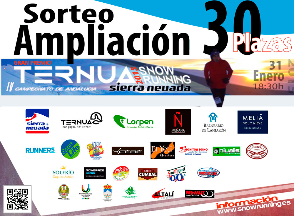 Debido a la gran demanda de solicitudes de inscripción que han cubierto las 500 plazas en menos de 3 días, el comité organizador ha decidido ampliar el cupo de participación para la 4ª Edición TERNUA Snow Running Sierra Nevada 2015, Campeonato de Andalucía, con 30 plazas que se asignarán por sorteo. Todas aquellas personas que deseen optar a una de estas plazas deberán tener en cuenta el siguiente procedimiento: