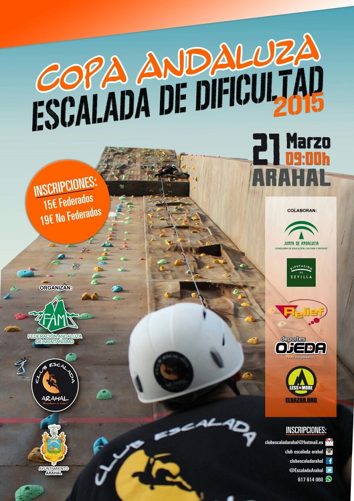 El Club de Escalada Arahal Encadenar o volar y la Federación Andaluza de Montañismo organizan la primera prueba de la Copa de Andalucía de Escalada de Dificultad 2015, una competición que constará de tres pruebas a desarrollar entre marzo y abril. El nuevo rocódromo en Arahal, de reciente construcción y el más alto que hay en nuestra comunidad autónoma (25 metros), será escenario de este evento que tendrá lugar el próximo 21 de marzo, y en el que por primera vez, competirá la categoría de Veteranos (a partir de 35 años), incluida recientemente en el Reglamento de competición de Escalada.