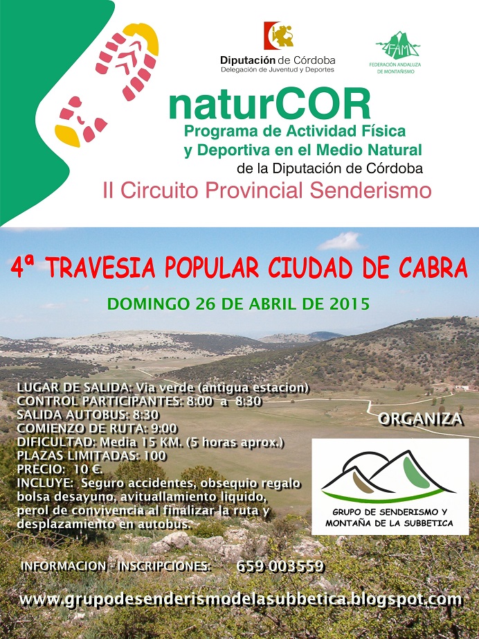 El próximo domingo 26 de abril de 2015, dentro del II Circuito Provincial de Senderismo de Córdoba, organizado por la Diputación a través del programa 'NATURCOR' junto con la Federación Andaluza de Montañismo, se celebrará la IV Travesía Popular Ciudad de Cabra.