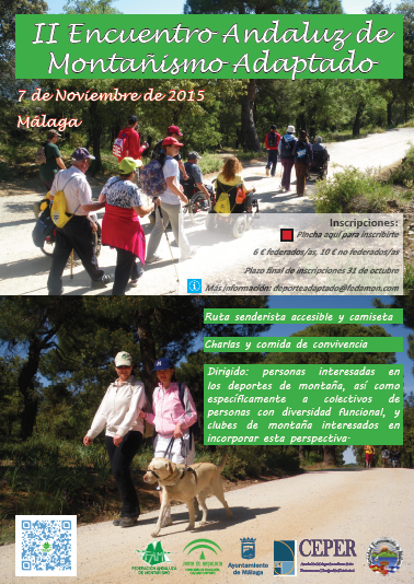 El Comité de Discapacidad, del Área Social de la Federación Andaluza de Montañismo celebra su II Encuentro Andaluz de Montañismo Adaptado el 7 de noviembre en Málaga, dirigido a todas las personas interesadas en los deportes de montaña, así como específicamente a colectivos de personas con diversidad funcional, y clubes de montaña interesados en incorporar esta perspectiva.