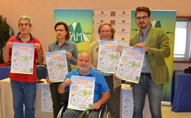El salón Abencerrajes del Hotel Nazaríes ha sido escenario de la presentación de la III Caminata Saludable de Granada que tendrá lugar el próximo 18 de octubre. En el acto han participado la delegado de Turismo y Deporte de la Junta de Andalucía en Granada, Ana Gámez, el coordinador del Instituto Andaluz de la Juventud en Granada, Guillermo Quero, el presidente de la Federación Andaluza de Montañismo, Julio Perea, y el delegado de la FAM en Granada, Rafael Morales.