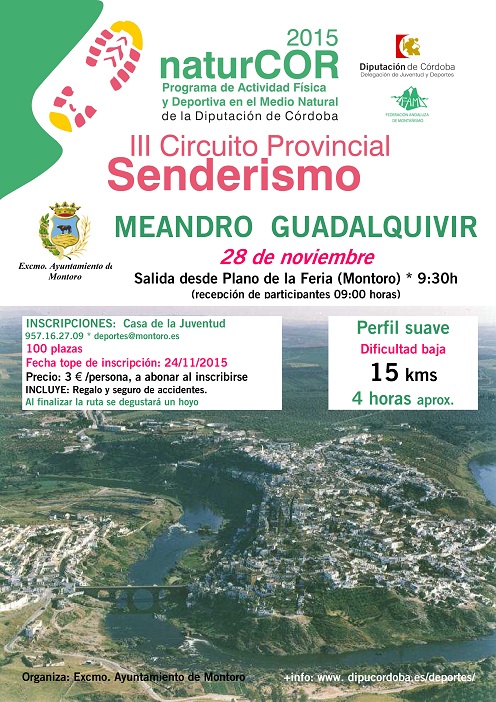 El sábado 28 de noviembre de 2015, dentro del III Circuito Provincial de Senderismo de Córdoba, organizado por la Diputación junto con la Federación Andaluza de Montañismo, se celebrará una nueva actividad, se trata de la III RUTA DE MONTORO: MEANDROS DEL GUADALQUIVIR, en la comarca del Alto Guadalquivir. En el cartel se indican los detalles de la inscripción, cuyo plazo finalizará el 24 de noviembre. En esta ruta, por la inscripción de 3 €, a los participantes se les obsequiará con un bastón telescópico, un hoyo de pan y además, en el caso de no estar federado, la cobertura de un seguro de accidentes para ese día. Las inscripciones limitadas a 100 plazas se pueden realizar en Casa de la Juventud 957.16.27.09