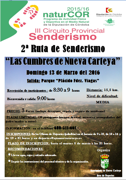 El Domingo 13 de marzo de 2016, dentro del III Circuito Provincial de Senderismo de Córdoba, organizado por la Diputación junto con la Federación Andaluza de Montañismo, se celebrará una nueva actividad, se trata de la II RUTA SENDERISMO "LAS CUMBRES DE NUEVA CARTEYA". en la comarca de Guadajoz - Campiña Este. En el cartel adjunto se indican los detalles de la inscripción, cuyo plazo finalizará el martes 8 de marzo. En esta ruta, por la inscripción de 3 €, a los participantes se les obsequiará con un detalle de regalo, guías y, en el caso de no estar federado, la cobertura de un seguro de accidentes para ese día. Las inscripciones se pueden realizar en la oficina de Deportes (Pabellón) de Nueva Carteya y en