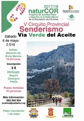 Y el domingo 6 de mayo de 2018 se celebrará quinta actividad de esta edición, en esta ocasión en el municipio de Doña Mencía y Luque, se trata de la RUTA de la Vía Verde del Aceite, en la comarca de la Subbéticas.