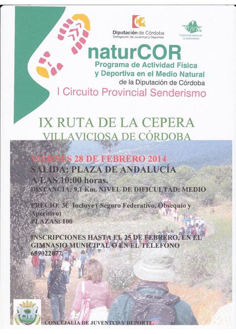 La próxima actividad del I Circuito Provincial de Senderismo de Córdoba, organizado por la Diputación a través del programa 'naturCOR' junto con la Federación Andaluza de Montañismo, será el viernes 28 de febrero de 2014, en el municipio de Villaviciosa de Córdoba. La VI EDICIÓN DE LA RUTA DE LA CEPERA discurre por un sendero señalizado el SL-A 75, pero aún en proceso de homologación. El plazo de inscripción finaliza el martes,día 25 de febrero. Para ello, los interesados pueden realizar su inscripción en las Instalaciones del Gimnasio Municipal.