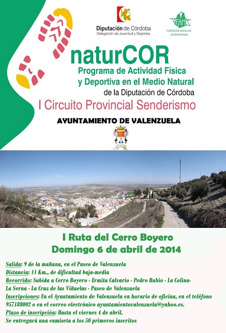 Sigue el I Circuito Provincial de Senderismo de Córdoba, organizado por la Diputación a través del programa 'naturCOR' junto con la Federación Andaluza de Montañismo. La próxima actividad será el Domingo 6 de ABRIL de 2014, en el municipio de Valenzuela. Se trata de la I RUTA DEL CERRO BOYERO que asciende a este cerro de 486 metros y lo rodea, disfrutando de buenas vistas de la campiña cordobesa. El plazo de inscripción finaliza el día 4 de abril. Para ello, los interesados pueden dirigirse al ayuntamiento de Valenzuela en horario de oficina, en el teléfono 957188002 o mediante correo electrónico