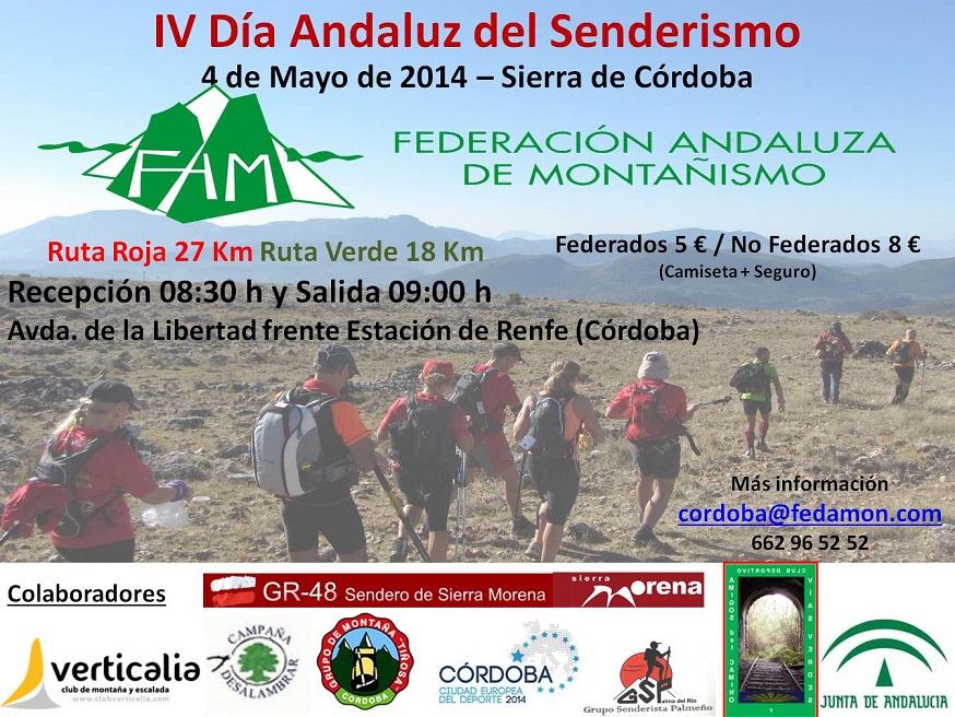 La Federación Andaluza de Montañismo, a través de su delegación en Córdoba, organizará el próximo 4 de mayo el IV Día Andaluz del Senderismo con dos rutas por la Sierra de Córdoba. Las inscripciones para federados es de 5 euros y para los no federados de 8 euros, que incluye camiseta y seguro).