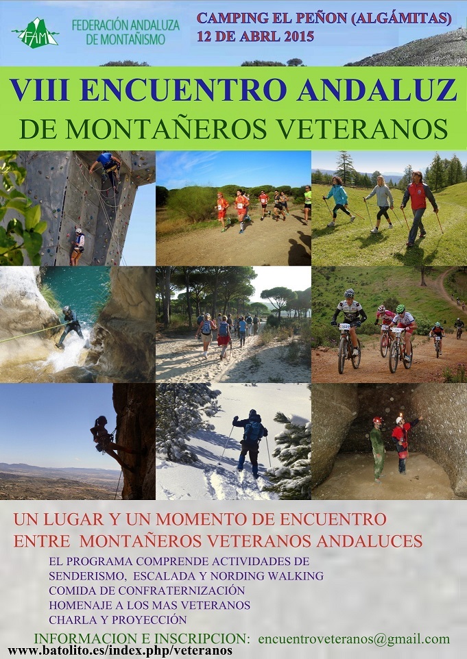 El Grupo de Senderismo el Batolito organiza el próximo 12 de abril el VIII Encuentro Andaluz de Montañeros Veteranos, actividad que tendrá lugar en el Camping Peñón Algámitas. El plazo de inscripción concluye el 31 de marzo. La cuota de la misma es de 10 euros para federados y de 15 para no federados. Las hojas de inscripciones deberán enviarse a