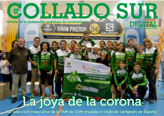 La Federación Andaluza de Montañismo publica el número 51 de Collado Sur Digital, revistal trimensual de la FAM. En este número de Junio'2015 podréis encontrar una amplia entrevista con Joan Garrigós, Presidente de la FEDME, ver las mejores imágenes de las finales del CADEBA tanto de la ceremonia de inauguración, como de las competiciones y la entrega de premios, y las clasificaciones. También se repasa los logros de la selección andaluza de Carreras por Montaña que en Alhaurín El Grande revalidó su título nacional masculino y su gran actuación en el Campeonato de España de KV. En esta edición, el club invitado es La Montanera de Huelva; contaremos también con los consejos de nuestro responsable del Comité de Seguridad, Pedro Partal, sobre en todo para esta época en la que el calor aprieta, para cerrar, después de otros asuntos con el Manifiesto de la FAM en defensa del Chorro. 28 páginas a todo color, en formato digital pasa página que esperamos sea de vuestro agrado.