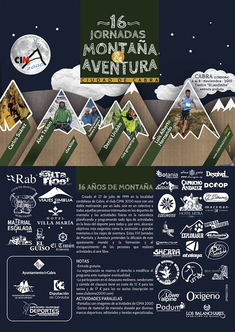 El Club CIMA 2000, organizador del evento, así como los participantes e inscritos, espera el momento esta tarde, instante en que comenzarán las XVI Jornadas de Montaña y Aventura 'Ciudad de Cabra', las únicas de la provincia de Córdoba y una de las cuatro que se desarrollan en Andalucía. Estas jornadas están avaladas por la Federación Andaluza de Montañismo (FAM), se han constituido por méritos propios en todo un referente no sólo andaluz sino de ámbito nacional, dado la cantidad y calidad de los ponentes que participan en el evento. Dichas Jornadas se celebran desde hoy viernes día 6 al 8 de noviembre de 2015 de la localidad egabrense.