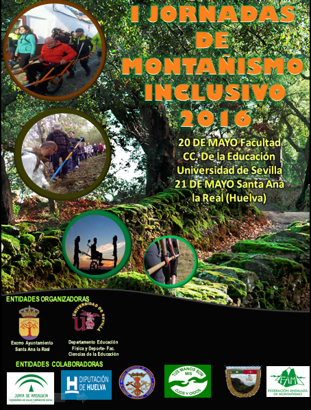 El Salón de Actos de la Facultad de Ciencias de la Educación de Sevilla (20 de mayo) y los parajes de Santa Anda la Real de Huelva (21 de mayo) son los lugares elegidos por los organizadores de las I Jornadas de Montañismo Inclusivo 2016. En esta actividad participa la Federación Andaluza de Montañismo a través del responsable de Montañismo Adaptado, Ángel Briones, quien ofrecerá en Sevilla una conferencia sobre Experiencias y Programas.