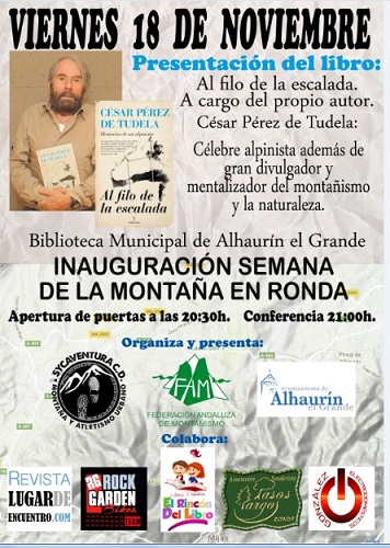 La inauguración de las jornadas tendrá lugar el viernes 18 de noviembre con la presentación del libro 'Al filo de la escalada' de su propio autor, César Pérez de Tudela, acto que tendrá lugar en la Biblioteca Municipal de Alhaurín el Grande a partir de las 21 horas.